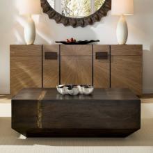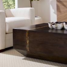 Our monolithic form of umber mango wood is inset with opposing racing stripes of natural faux horn resin. Cascading in waterfalls down the sides, these impactful details give a cantilevered effect to the split veneer surface, adding to the natural beauty. Finish will vary.