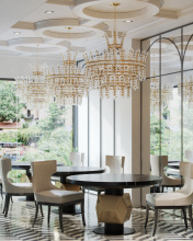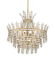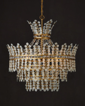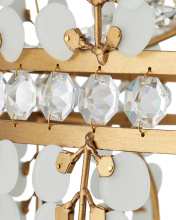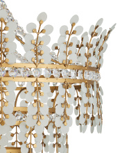 The Bradshaw Chandelier has an elegant classical profile for which its designer, Bunny Williams, is renowned. Made of wrought iron in a warm brass finish, the layered shape has sparkling crystal baguettes in each of the rings and frosted glass discs that flutter up and extend down to create flourishes on the top and bottom, the uppermost curved like coronets. The milky glass pieces, which are made specifically for this fixture individually, have edges that are polished for a sophisticated feel. Each one and each of the crystals are attached by hand. Williams was inspired by an antique with an Art Deco feel when she envisioned this luminous four-light fixture. Adjustable from 44.5" to 112.5" with use of included chain/rod kit/cable. If your space calls for a longer drop, additional chain/rods/cable is available for purchase.