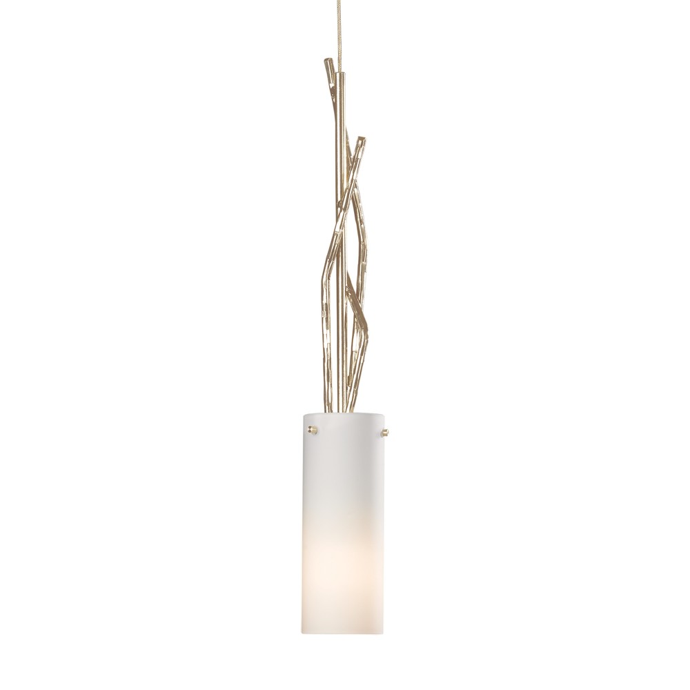 Sylvan shapes meet artisan imagination. The multi-faceted "twigs" are hammered for texture and shape. The sculpture branches up from the sleek, glass tube and twines around the cable housing. Available in Sterling, Modern Brass, Vintage Platinum or Soft Gold finishes.