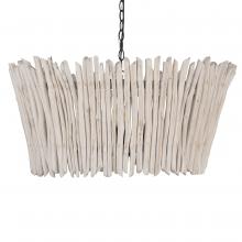 Staggered branches of eucalyptus are meticulously linked together to form a tapered bouquet shade, showcasing exceptional handcraftsmanship. Each branch is individually shaped, with the wood finished in a hand-applied Weathered White that beautifully compl