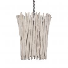 Staggered branches of eucalyptus are meticulously linked together to form a tapered bouquet shade, showcasing exceptional handcraftsmanship. Each branch is individually shaped, with the wood finished in a hand-applied Weathered White that beautifully compl