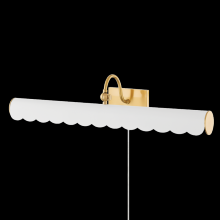 Highlight artwork, photos or other wall décor with this pretty, plug-in picture light. A new traditional take on the classic design, it features a sweet scalloped edge and curved arm that adds warmth and feels fresh. Fifi is available in three sizes and finishes; Aged Brass, Soft White, and Soft Navy to fit any space and color scheme. Part of our Ariel Okin x Mitzi Tastemakers collection.