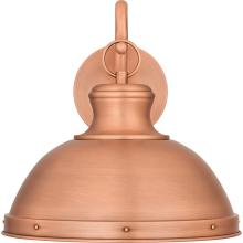Reminisce with Jameson, an outdoor wall lantern crafted from solid copper. A stunning aged copper finish is highlighted by a rounded hook design and small grommet details, lending a hint of industrial charm to the romantic dome-shaped silhouette. While des