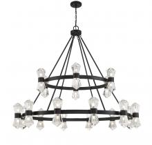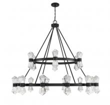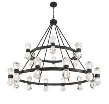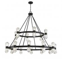 Large in scale and style, the Savoy House Dryden 36-light chandelier is like a beautiful diamond bracelet for your home. Two tiers of dramatically faceted and pointed pieces of crystal decorate a simple circular structure that is finished in goes-with-anything matte black. Dryden is 52" in height and 60" in diameter. It uses thirty-six G9 size LED bulbs of up to 4 watts per bulb. Comes with 120" of chain and 144" of cord.