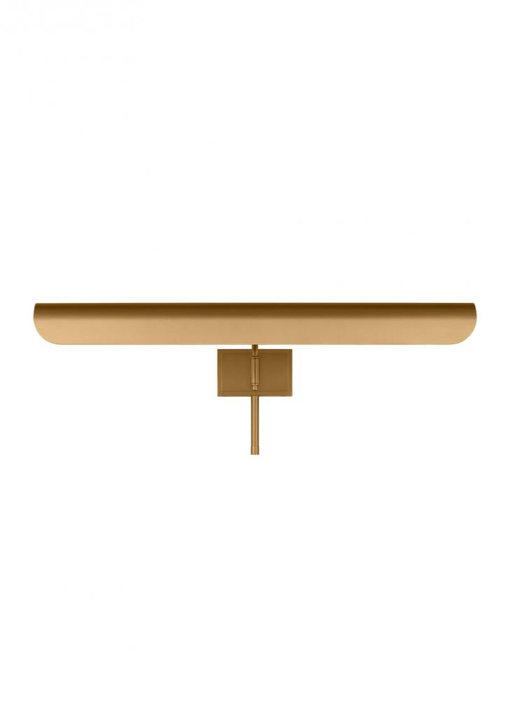 Inspired by a ship's outer hull, the Hull series by Chapman & Myers has a unique shade of these picture lights made from a single piece of metal bent into a cylindrical form. These picture lights have an open-ended design directing light both down and to the sides. A subtle horse saddle design and double barrel back-plate detail that pivots in the direction needed. Available in three sizes and two finish options.
